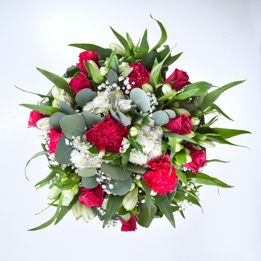 Our elegant bouquet is a tribute to natural beauty and sophisticated design. A striking medley of deep red roses and tender carnations is intertwined with the radiant charm of mini white chrysanthemums and the exquisite lightness of gypsophila. Accented with the purity of white alstroemeria and the classic beauty of aspidistra leaves, this arrangement is crafted to captivate and delight.